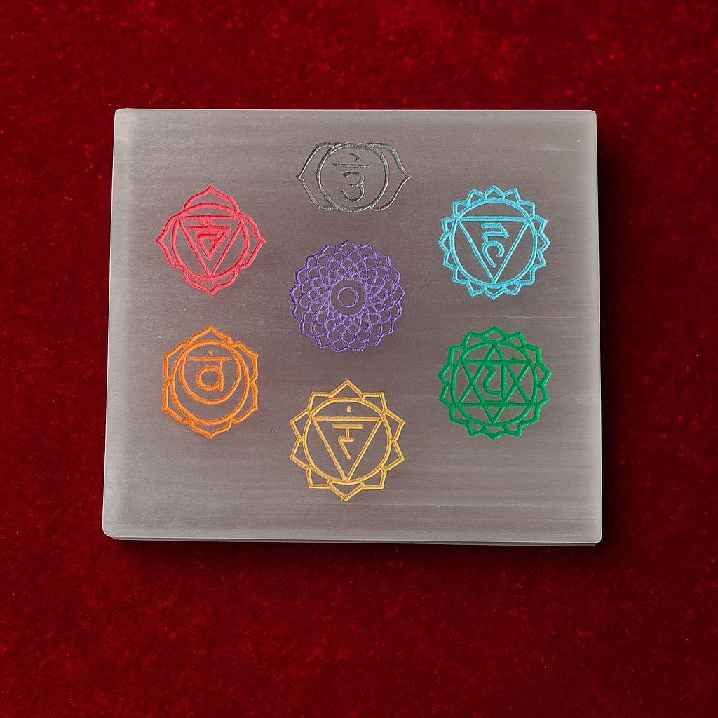 This radiant 7 Chakra Selenite Plate is a powerful tool for energy cleansing, balance, and spiritual alignment. Selenite is known for its high-vibrational, purifying energy that clears negativity and promotes peace, clarity, and connection to higher consciousness. The seven engraved chakra symbols correspond to the energy centers of the body, helping to harmonize and activate each chakra while enhancing meditation, healing, and manifestation practices. Use this plate to cleanse crystals, enhance your sacred space, or elevate your spiritual rituals with its luminous, transformative energy.